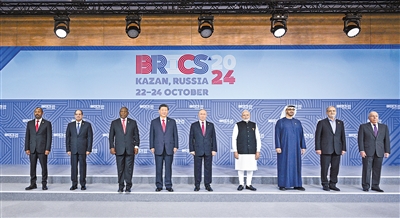 当地时间10月23日上午,金砖国家领导人第十六次会晤在喀山会展中心举行。俄罗斯总统普京主持会晤。中国国家主席习近平、巴西总统卢拉(线上)、埃及总统塞西、埃塞俄比亚总理阿比、印度总理莫迪、伊朗总统佩泽希齐扬、南非总统拉马福萨、阿联酋总统穆罕默德等出席。这是会晤期间,金砖国家领导人集体合影。 |
