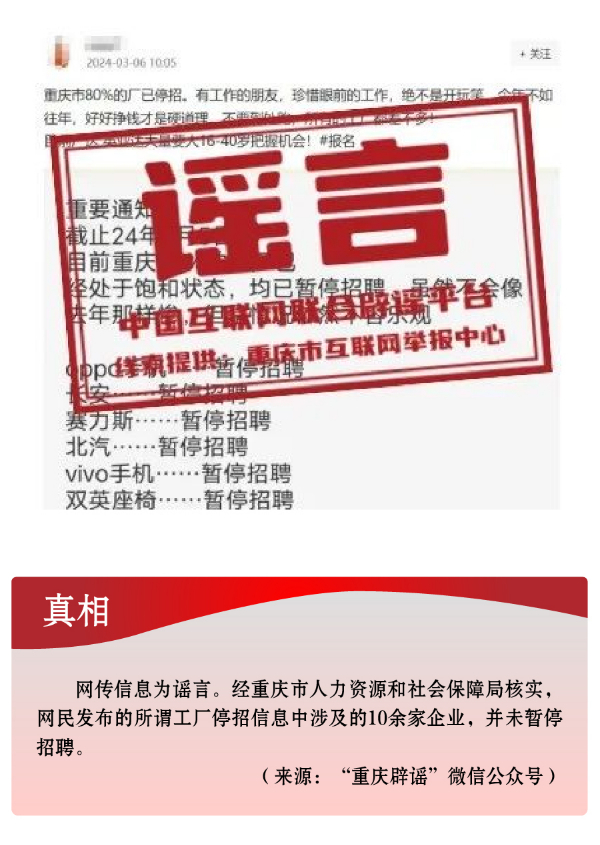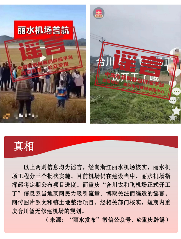 搭蹭热点散播民生类谣言,渲染焦虑。3月,全国两会召开,“民生清单”热度高。“春招”“春游”等时间节点,有关招工就业、疫病传染等内容也成为个别网民博眼球的素材。一些个人或自媒体歪曲甚或虚构事实,编造散布社会民生谣言,引发公众不必要的焦虑。如,别有用心者恶意虚构事实,发布“重庆80%的工厂暂停招聘”“湖南郴州疫情卷土重来”等虚假信息,渲染负面情绪、徒增公众忧虑、扰乱社会秩序;还有人为吸引流量、博取关注,根据主观臆想,采取移花接木等手段,散播“京沪高速公路停止收费”“浙江丽水机场已建成投用并首航”“重庆合川太和飞机场正式开建”等涉重大基础设施建设项目的假消息,误导公众认知,扰乱群众交通出行秩序。