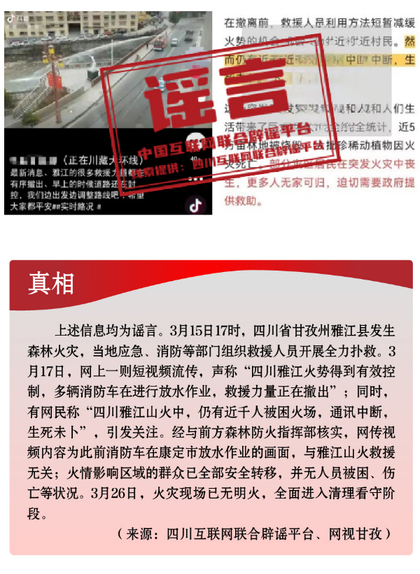为博流量炮制安全类谣言,引发恐慌。春季历来是森林火灾高发时段。加之开春后,工厂企业复产复工,致灾因素明显增多。3月,全国多地发生火灾事故,一些网民为蹭热点、博流量,趁机编织谣言,引发公众恐慌。3月中旬,四川省甘孜州雅江县发生森林火灾,在当地应急、消防等部门组织救援人员全力扑救之际,却有人编造“四川雅江山火救援力量正在撤出”“雅江仍有近千人被困火场”“雅江山火有三名扑火人员牺牲”等失实信息,严重干扰灾害应急响应和救援工作。“重庆南坪商业大楼火灾伤亡惨重”“湖南省长沙市天心区发生重大刑案,警方发布悬赏通告”“天津一银行发生抢劫”等严重失实的涉公共安全类视频流传网络,或是造谣者自编自导,或是利用ai技术伪造,却引发群众恐慌、造成恶劣影响。此外,“绿得发黑的菠菜不能吃”“清明蔗、毒过蛇”等食品安全类谣言,则是利用了时令和人们对食物中毒的担忧情绪,夸大其词、危言耸听,目的都是贩卖焦虑、制造恐慌,进而吸引眼球、骗取流量。
